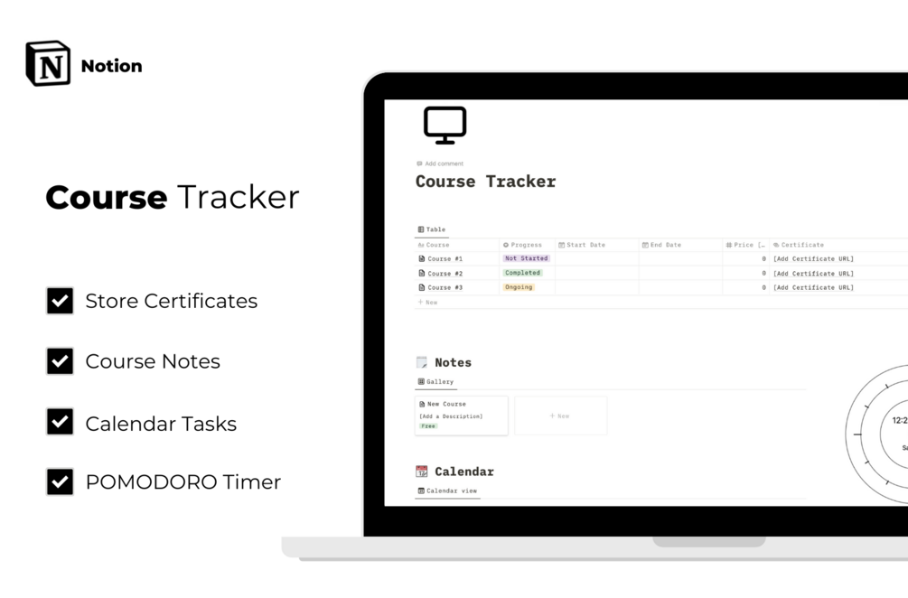 A Notion Course Tracker with a Dashboard - to track all your Courses, to make Notes, set Tasks, an Analog clock and a POMODORO Timer to boost your Productivity.