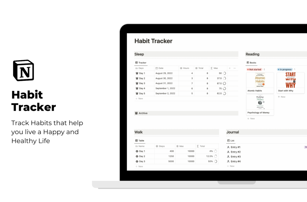 With the Notion Habit Tracker - You can live a healthy + happy life by developing the right Habits.